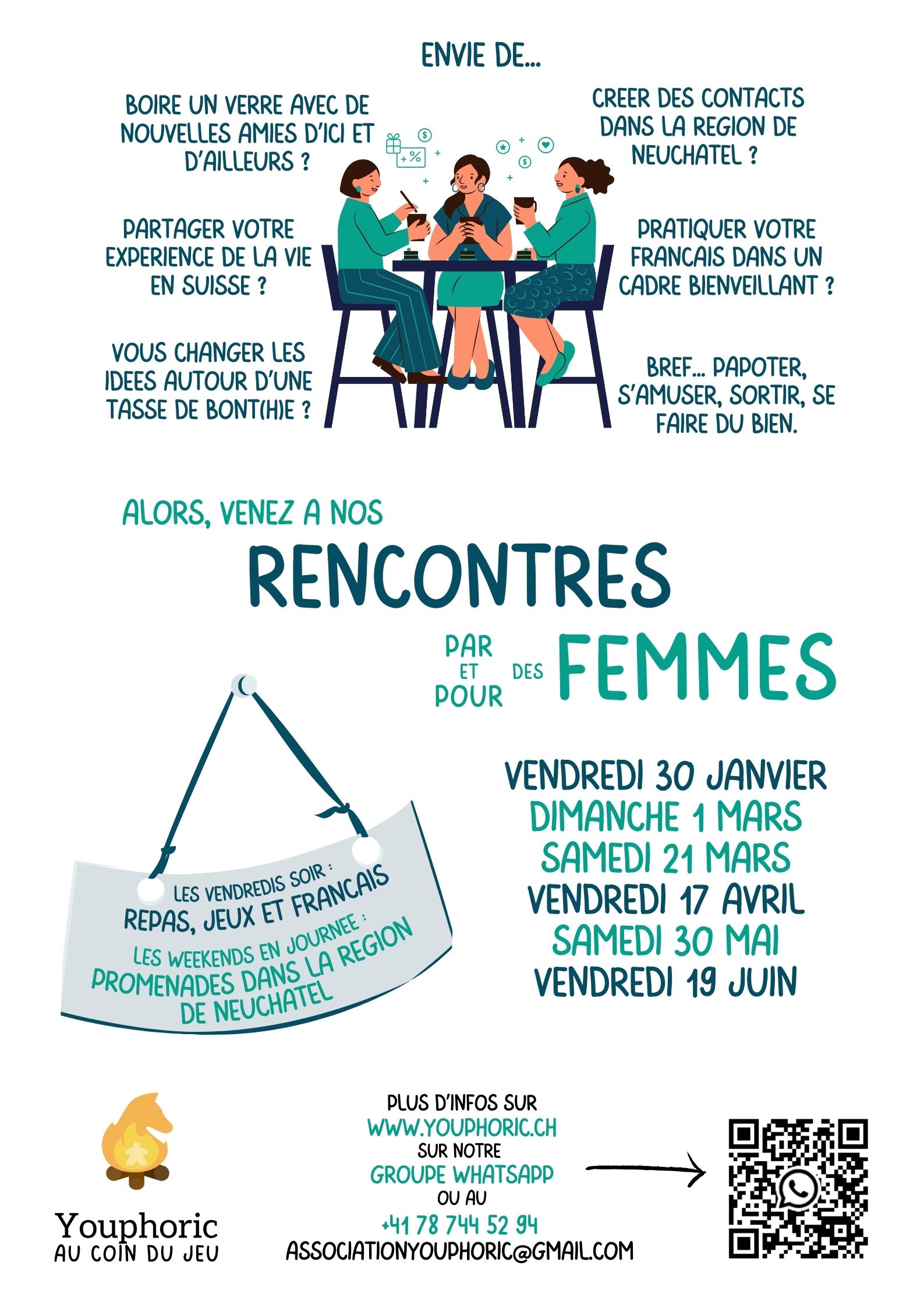 Rejoignez notre groupe WhatsApp : Youphoric – Women in Switzerland ou contactez-nous pour toute question et inscription.